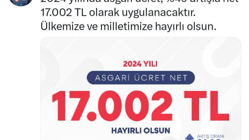 Cumhurbaşkanı Recep Tayyip Erdoğan yaptığı acıklamada: "2024 yılında asgari ücret, %49 artışla net 17.002 TL olarak uygulanacaktır. Ülkemize ve milletimize hayırlı olsun." dedi.
